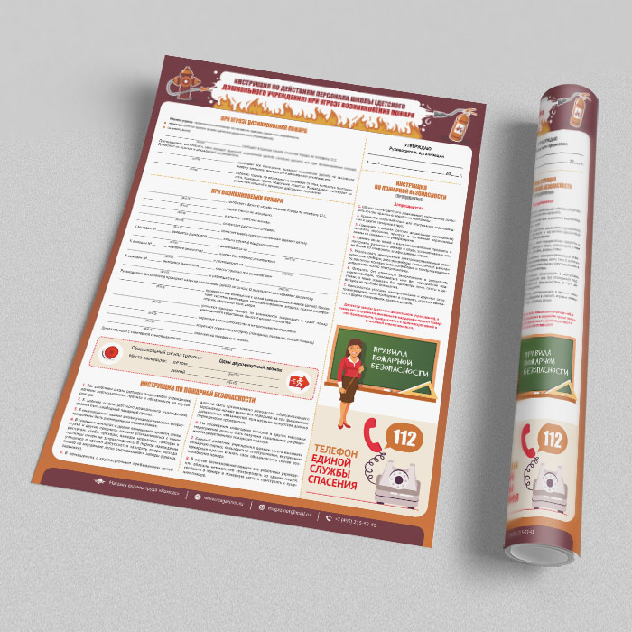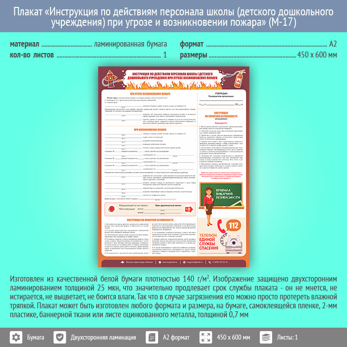 Плакат «Инструкция по действиям персонала школы (детского дошкольного учреждения) при угрозе и возникновении пожара» (М-17, ламинированная бумага, А2, 1 лист) в Альметьевске купить