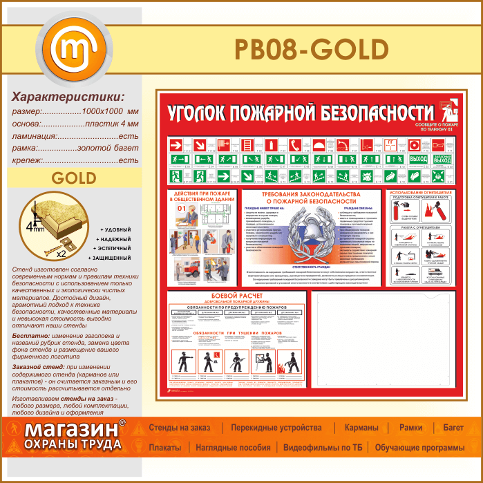 Стенд «Уголок пожарной безопасности» с карманом А3 формата (PB-08-GOLD) в Альметьевске купить