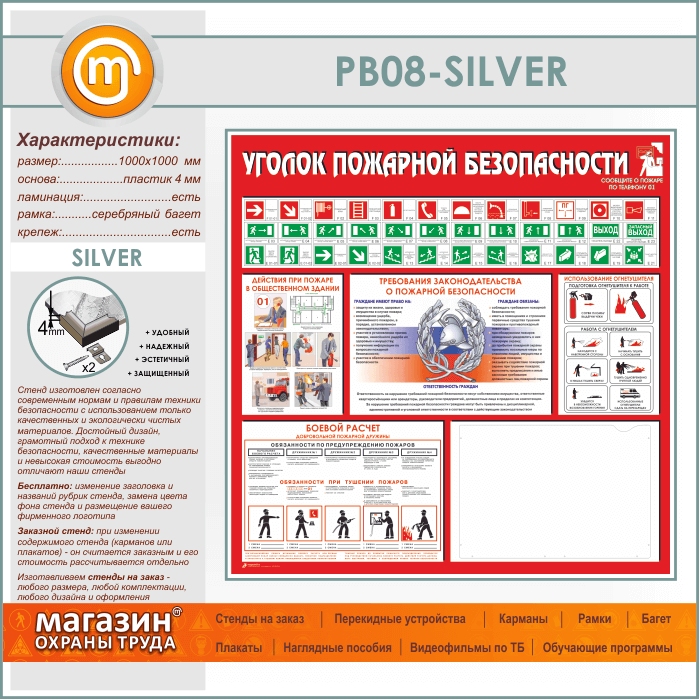 Стенд «Уголок пожарной безопасности» с карманом А3 формата (PB-08-SILVER) в Альметьевске купить