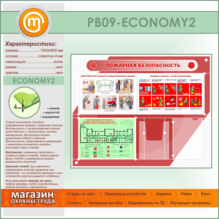 Стенд «Пожарная безопасность» с планом эвакуации, плоским и объемным карманами (PB-09-ECONOMY2) в Альметьевске купить