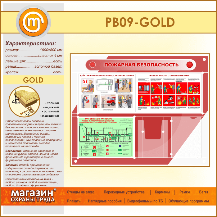 Стенд «Пожарная безопасность» с планом эвакуации, плоским и объемным карманами (PB-09-GOLD) в Альметьевске купить