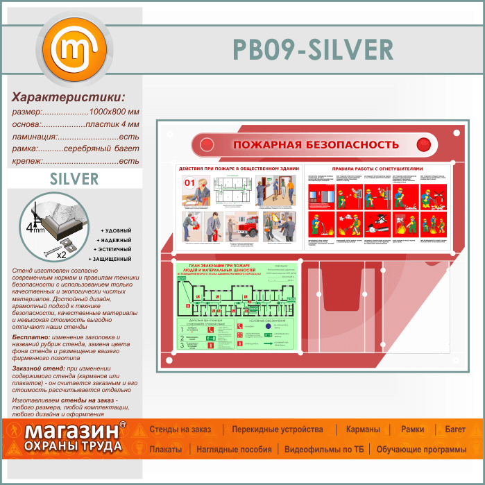Стенд «Пожарная безопасность» с планом эвакуации, плоским и объемным карманами (PB-09-SILVER) в Альметьевске купить