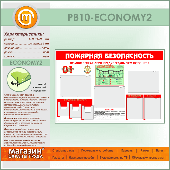 Стенд «Пожарная безопасность» с планом эвакуации, 5 плоскими и 3 объемными карманами (PB-10-ECONOMY2) в Альметьевске купить