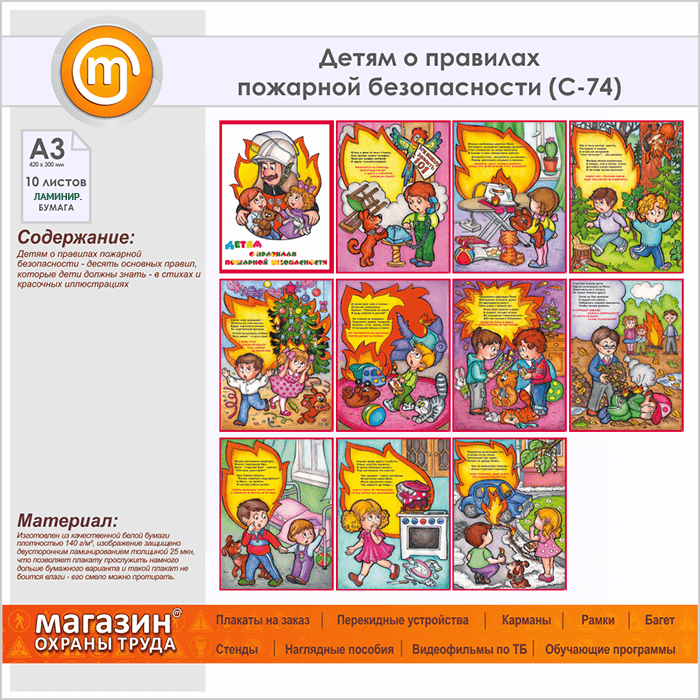Плакаты «Детям о правилах пожарной безопасности» (С-74, ламинированная бумага, А3, 10 листов) в Альметьевске купить