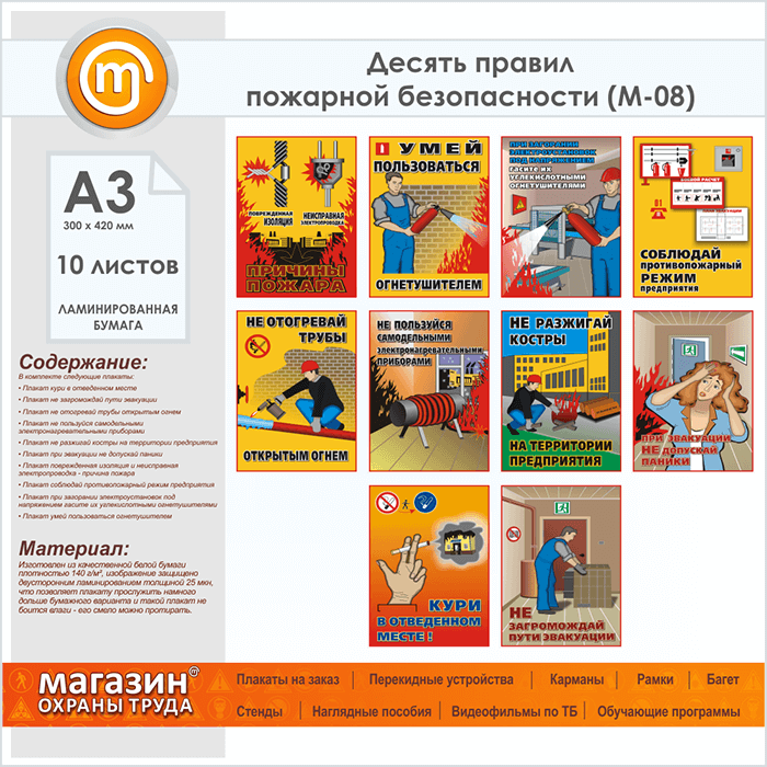 Плакаты «Десять правил пожарной безопасности» (М-08, ламинированная бумага, А3, 10 листов) в Альметьевске купить