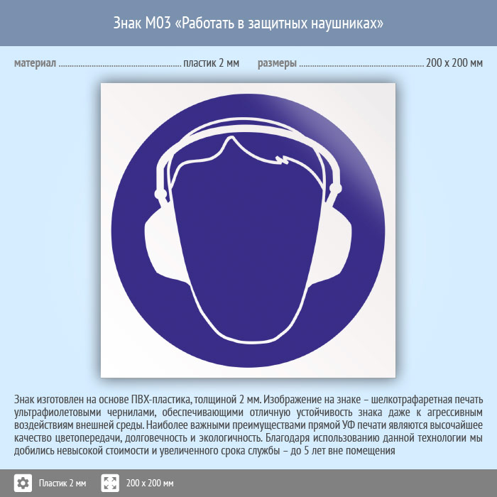 Знак M03 «Работать в защитных наушниках» (пластик, 200х200 мм) в Альметьевске купить