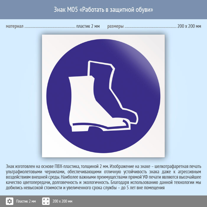 Знак M05 «Работать в защитной обуви» (пластик, 200х200 мм) в Альметьевске купить