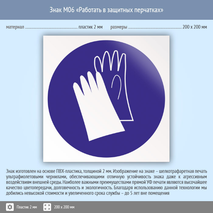 Знак M06 «Работать в защитных перчатках» (пластик, 200х200 мм) в Альметьевске купить