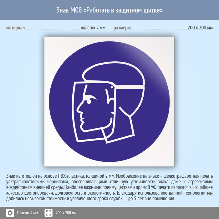 Знак M08 «Работать в защитном щитке» (пластик, 200х200 мм) в Альметьевске купить