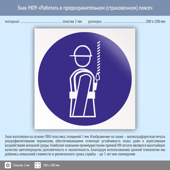 Знак M09 «Работать в предохранительном (страховочном) поясе» (пластик, 200х200 мм) в Альметьевске купить