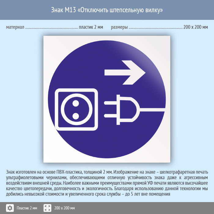 Знак M13 «Отключить штепсельную вилку» (пластик, 200х200 мм) в Альметьевске купить