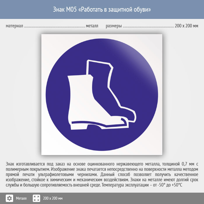 Знак M05 «Работать в защитной обуви» (металл, 200х200 мм) в Альметьевске купить