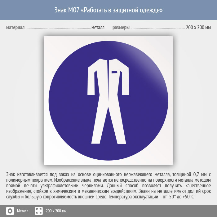 Знак M07 «Работать в защитной одежде» (металл, 200х200 мм) в Альметьевске купить