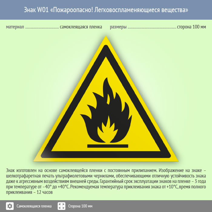 Знак W01 «Пожароопасно! легковоспламеняющиеся вещества» (пленка, сторона 100 мм) в Альметьевске купить