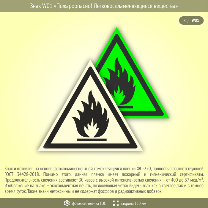 Знак W01 «Пожароопасно! легковоспламеняющиеся вещества» (фотолюминесцентная пленка ГОСТ 34428-2018, сторона 150 мм) в Альметьевске купить