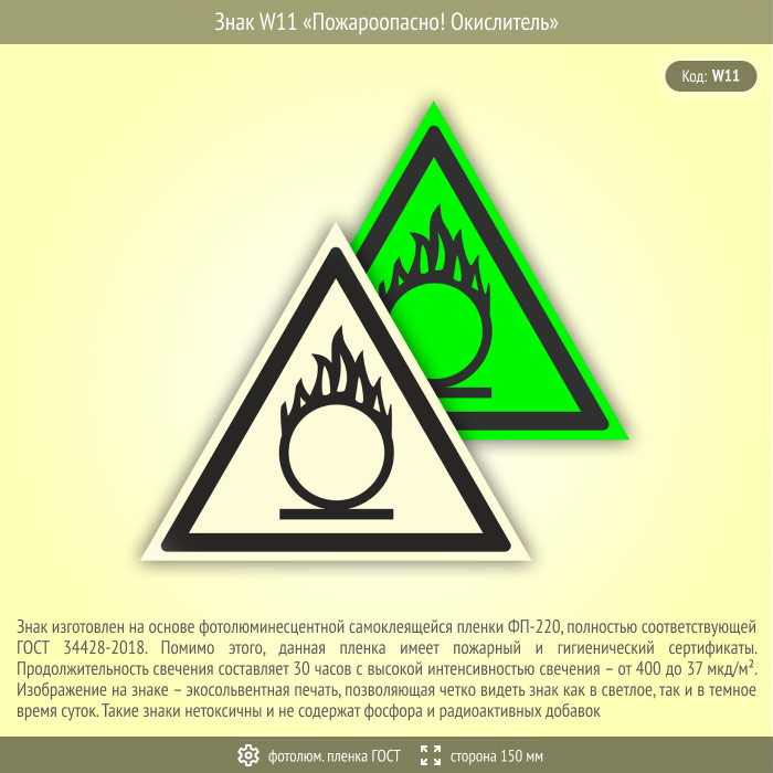 Знак W11 «Пожароопасно! окислитель» (фотолюминесцентная пленка ГОСТ 34428-2018, сторона 150 мм) в Альметьевске купить