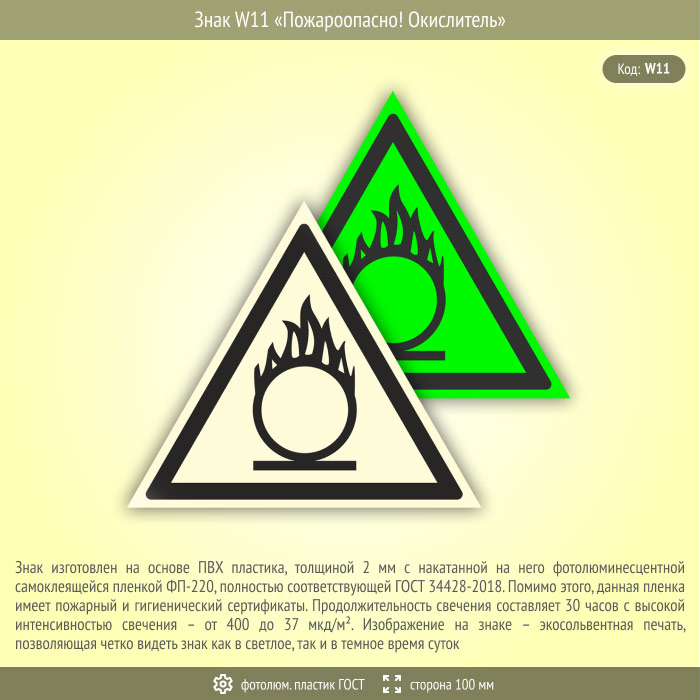 Знак W11 «Пожароопасно! Окислитель» (фотолюминесцентный пластик ГОСТ 34428-2018, сторона 100 мм) в Альметьевске купить