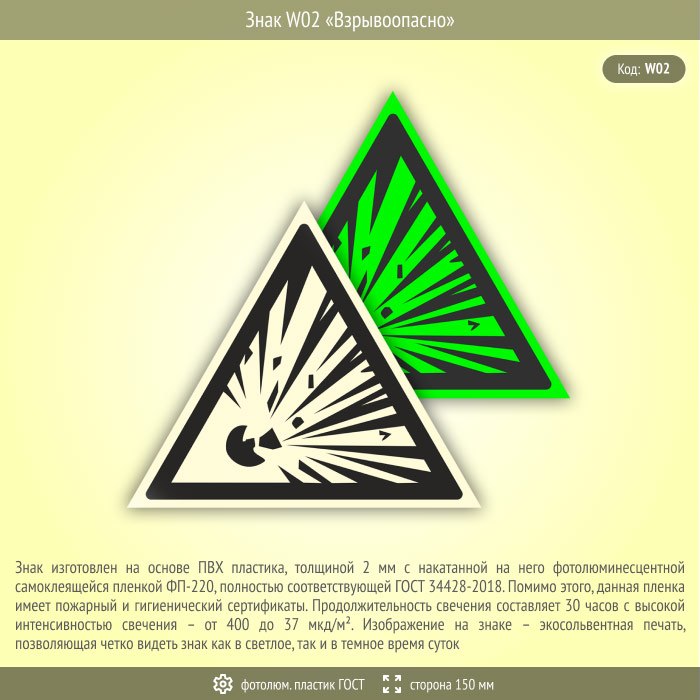 Знак W02 «Взрывоопасно» (фотолюминесцентный пластик ГОСТ 34428-2018, сторона 150 мм) в Альметьевске купить