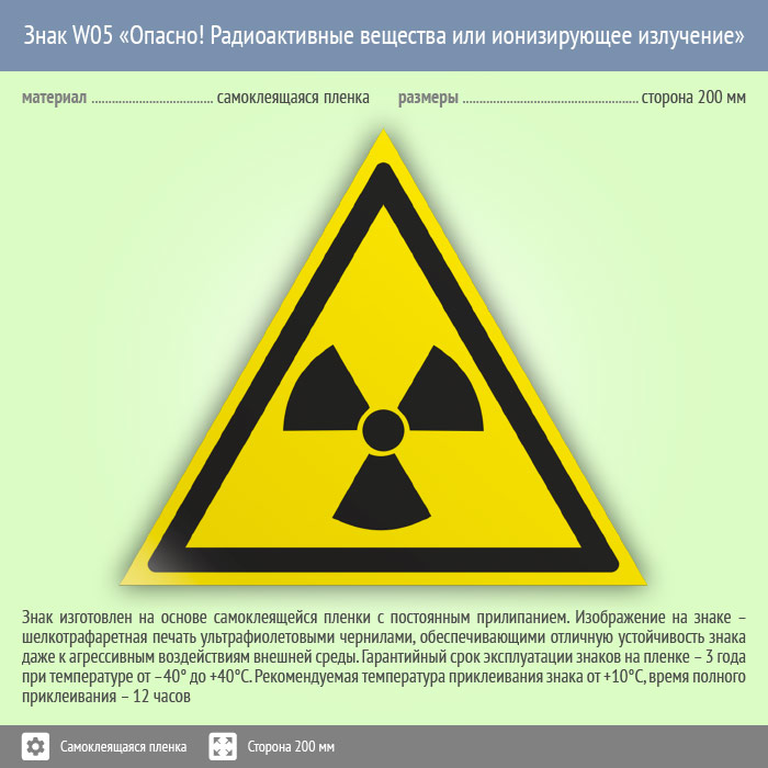 Знак W05 «Опасно! радиоактивные вещества или ионизирующее излучение» (пленка, сторона 200 мм) в Альметьевске купить
