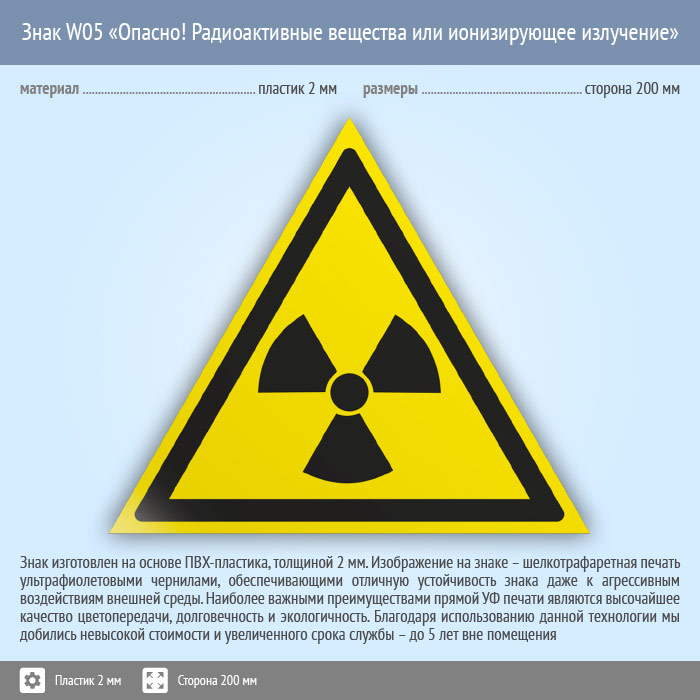 Знак W05 «Опасно! радиоактивные вещества или ионизирующее излучение» (пластик, сторона 200 мм) в Альметьевске купить