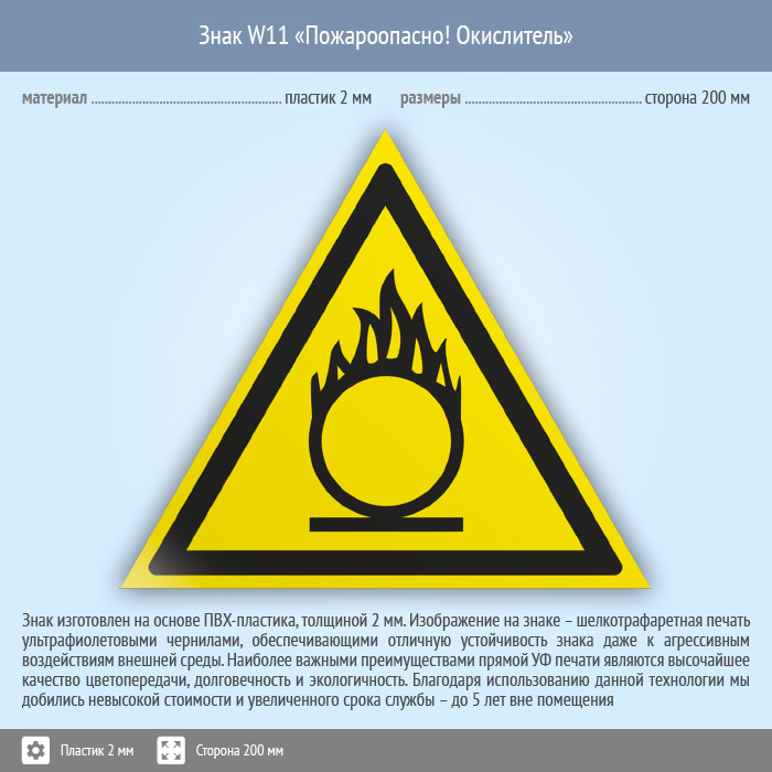 Знак W11 «Пожароопасно! окислитель» (пластик, сторона 200 мм) в Альметьевске купить