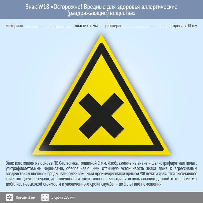 Знак W18 «Осторожно! вредные для здоровья аллергические (раздражающие) вещества» (пластик, сторона 200 мм) в Альметьевске купить