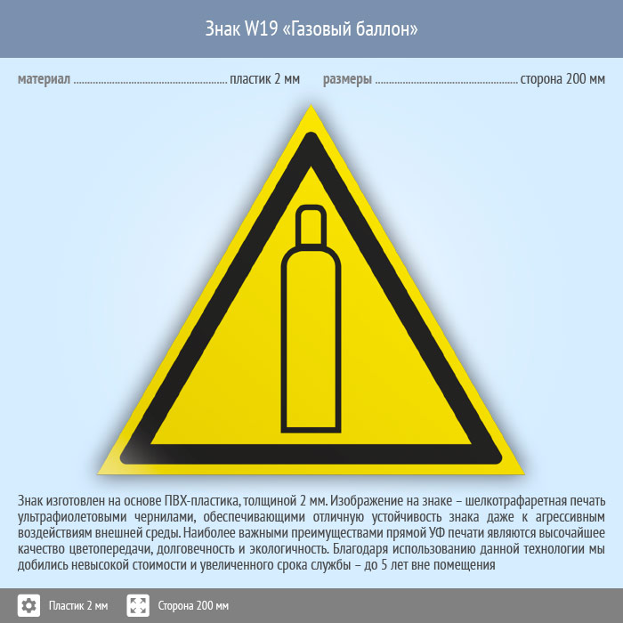 Знак W19 «Газовый баллон» (пластик, сторона 200 мм) в Альметьевске купить
