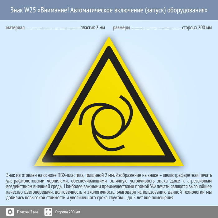 Знак W25 «Внимание! автоматическое включение (запуск) оборудования» (пластик, сторона 200 мм) в Альметьевске купить