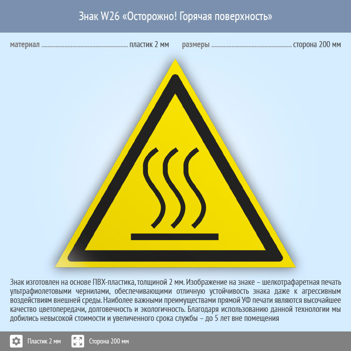 Знак W26 «Осторожно! горячая поверхность» (пластик, сторона 200 мм) в Альметьевске купить
