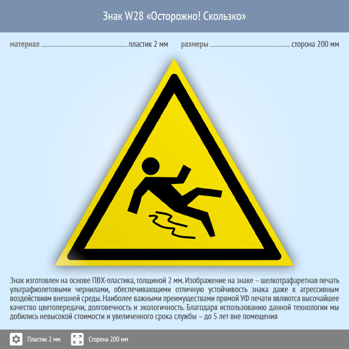 Знак W28 «Осторожно! скользко» (пластик, сторона 200 мм) в Альметьевске купить