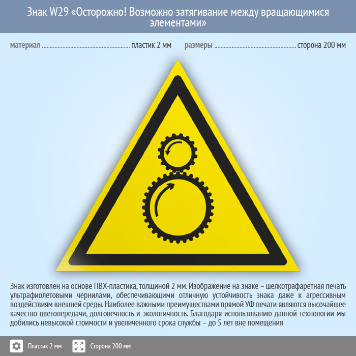 Знак W29 «Осторожно! возможно затягивание между вращающимися элементами» (пластик, сторона 200 мм) в Альметьевске купить