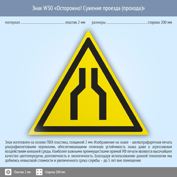 Знак W30 «Осторожно! сужение проезда (прохода)» (пластик, сторона 200 мм) в Альметьевске купить