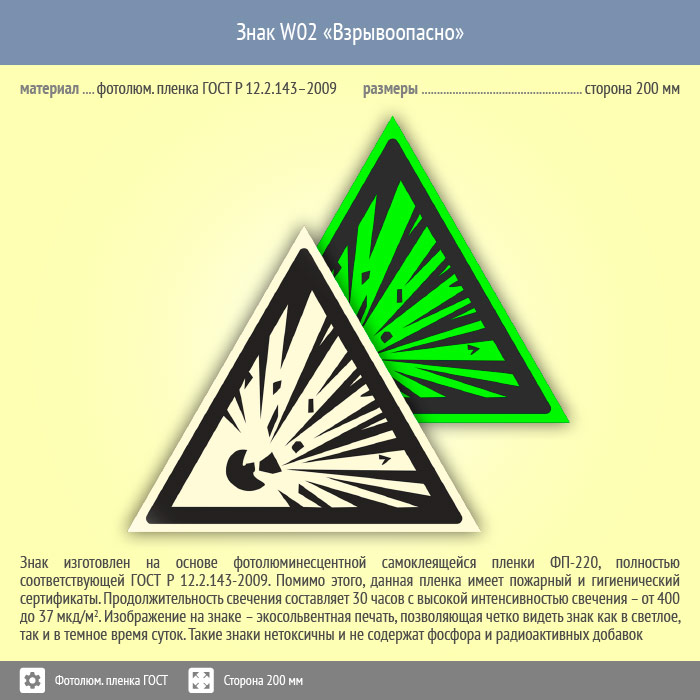 Знак W02 «Взрывоопасно» (фотолюминесцентная пленка ГОСТ 34428-2018, сторона 200 мм) в Альметьевске купить
