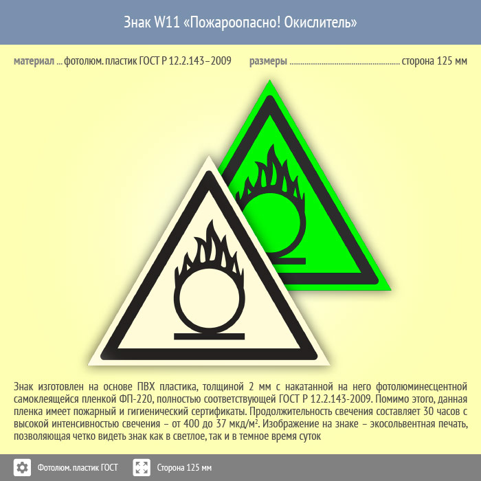 Знак W11 «Пожароопасно! Окислитель» (фотолюминесцентный пластик ГОСТ 34428-2018, сторона 125 мм) в Альметьевске купить