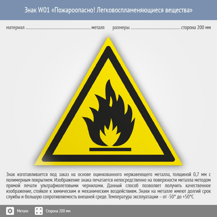 Знак W01 «Пожароопасно! легковоспламеняющиеся вещества» (металл, сторона 200 мм) в Альметьевске купить