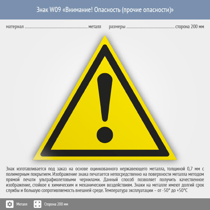 Знак W09 «Внимание! опасность (прочие опасности)» (металл, сторона 200 мм) в Альметьевске купить