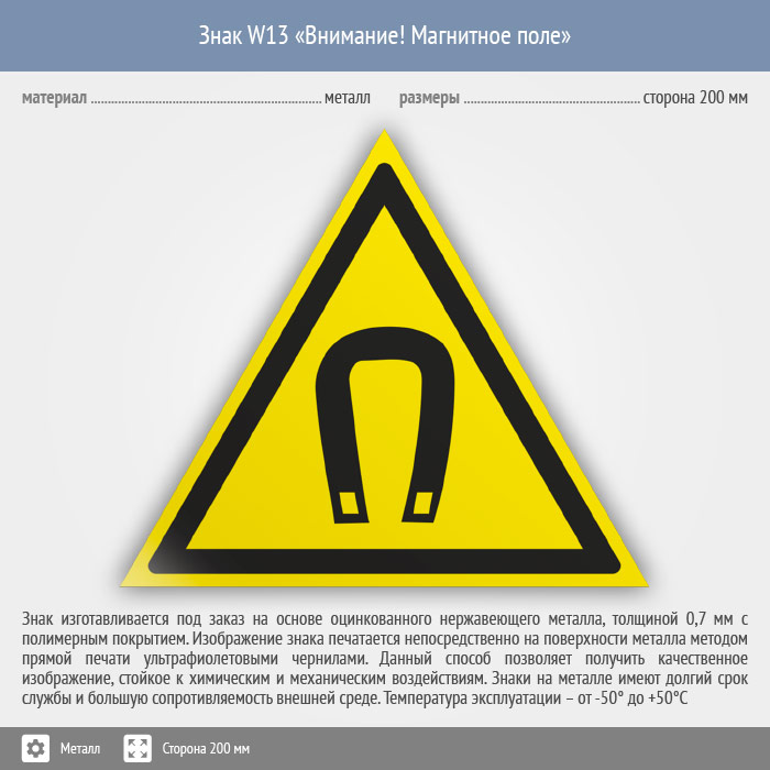 Знак W13 «Внимание! магнитное поле» (металл, сторона 200 мм) в Альметьевске купить
