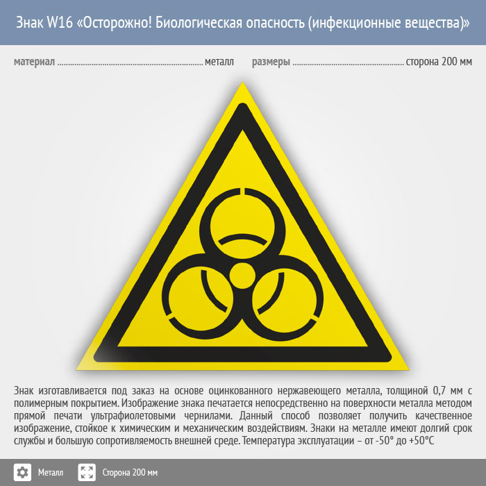 Знак W16 «Осторожно! биологическая опасность (инфекционные вещества)» (металл, сторона 200 мм) в Альметьевске купить