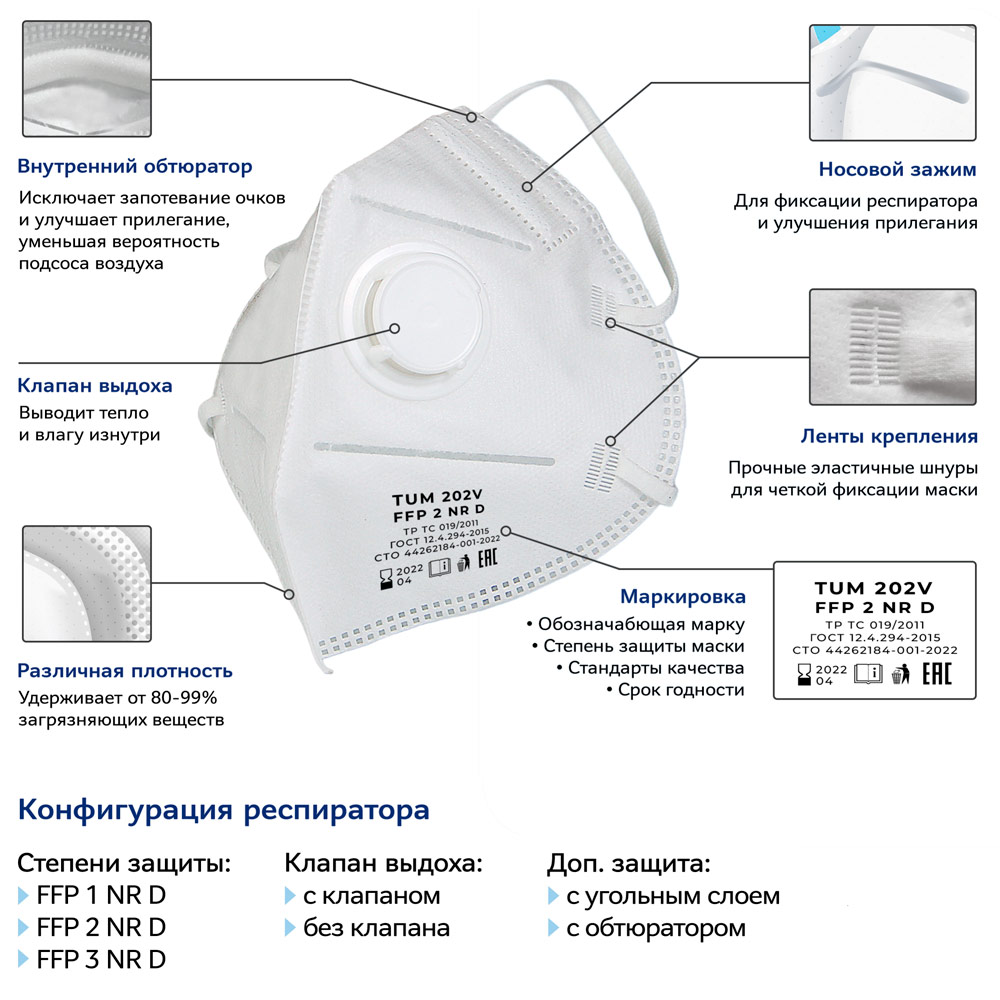 Респиратор противоаэрозольный TUM 302СV (FFP3) с клапаном и угольным слоем, к-т 10 шт в Альметьевске купить
