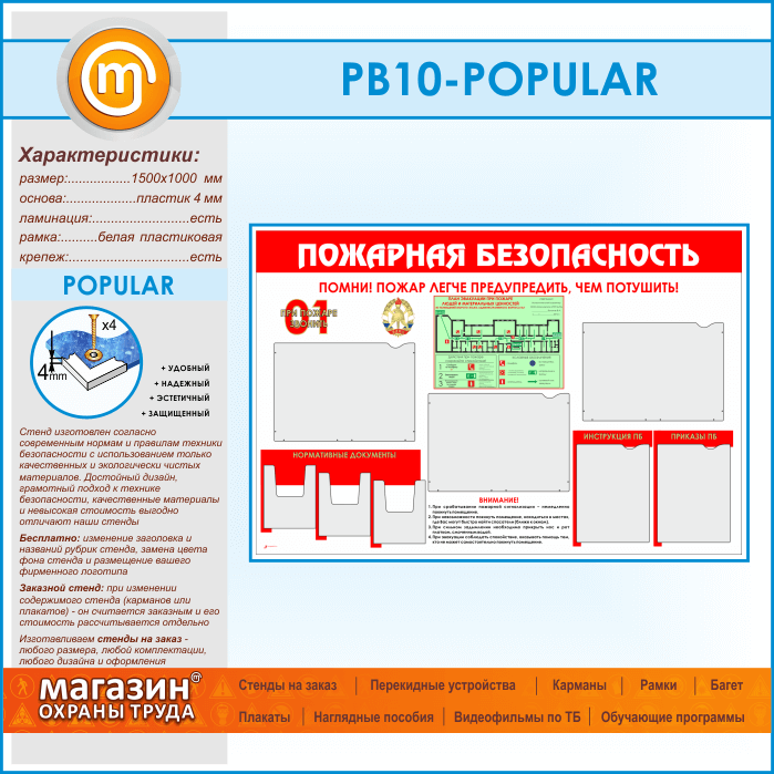 Стенд «Пожарная безопасность» с планом эвакуации, 5 плоскими и 3 объемными карманами (PB-10-POPULAR)