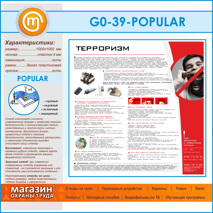 Стенд «Терроризм» – очень яркий и красочный стенд с правилами по предупреждению террористических актов и действиями при угрозе взрыва, а также его последствиями, приведены примеры действий если после взрыва начался пожар и что делать, если завалило обломками стен. Информация, расположенная на стенде расскажет вам про порядок действий при эвакуации и как вести себя, если вы оказались заложником и что делать во время освобождения