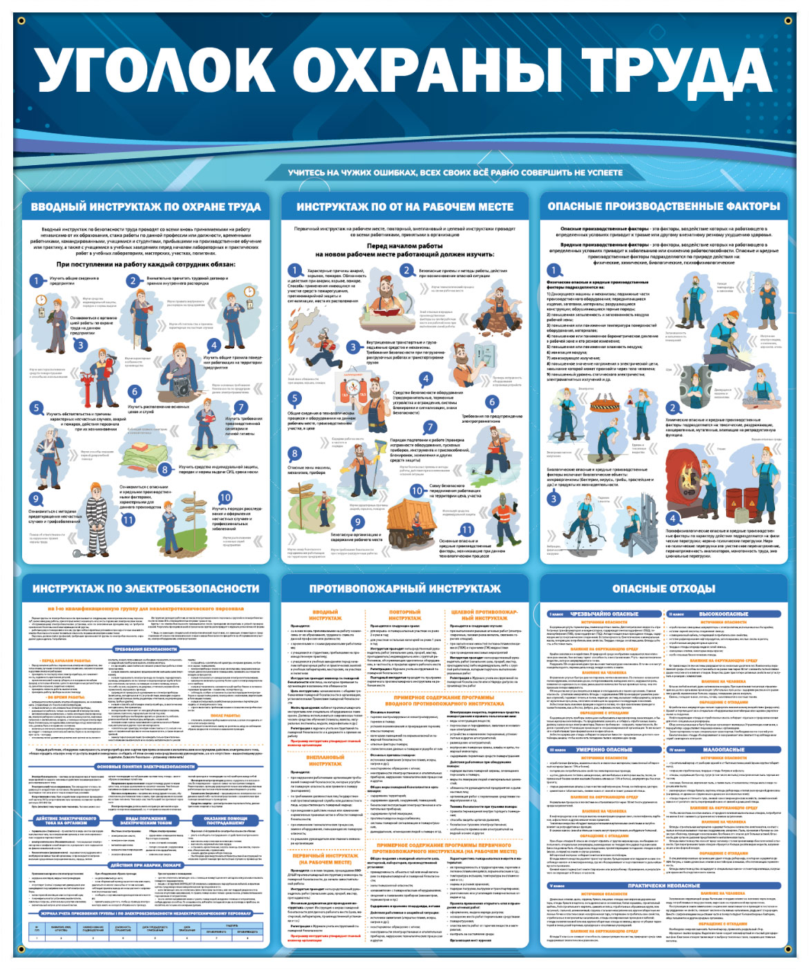 Стенд «Уголок охраны труда» (OT-36) содержит вводный инструктаж по ОТ, инструктаж по ОТ на рабочем месте, информацию об опасных производственных факторах, об опасных отходах, а также инструктажи по электробезопасности и по пожарной безопасности.