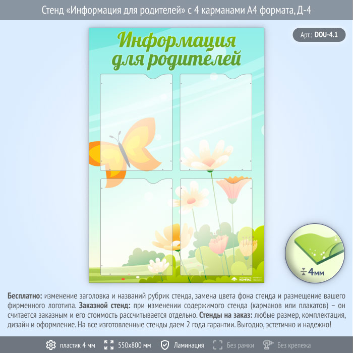 Стенд «Информация для родителей» с 4 карманами А4 формата (DOU-4.1) в Альметьевске купить