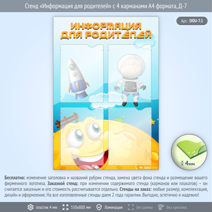 Стенд «Информация для родителей» с 4 карманами А4 формата (DOU-7.1) в Альметьевске купить