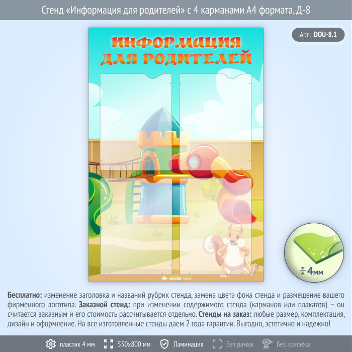 Стенд «Информация для родителей» с 4 карманами А4 формата (DOU-8.1) в Альметьевске купить