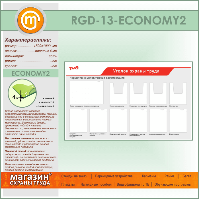 Стенд «Уголок охраны труда» с 1 плоским карманом А3 формата, 6 плоскими и 4 объемными карманами А4 формата (RGD-13-ECONOMY2) в Альметьевске купить