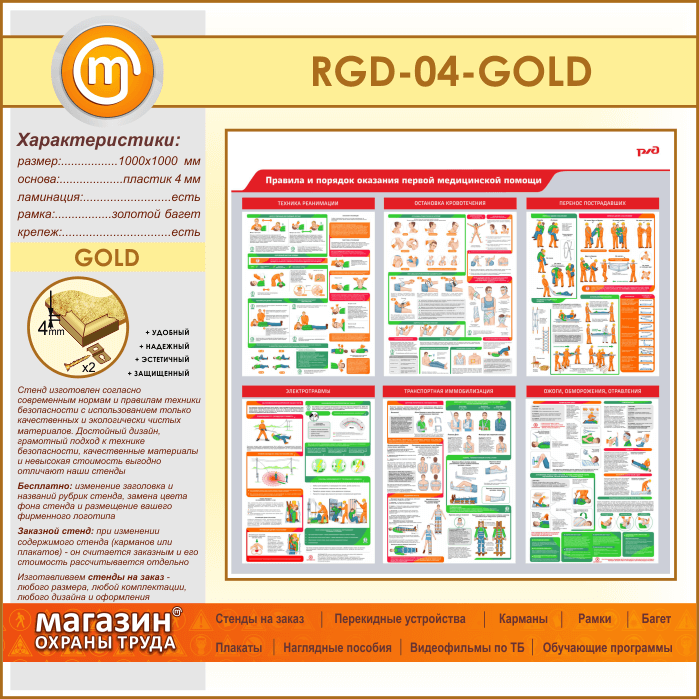 Стенд «Правила и порядок оказания первой медицинской помощи» (RGD-04-GOLD) в Альметьевске купить