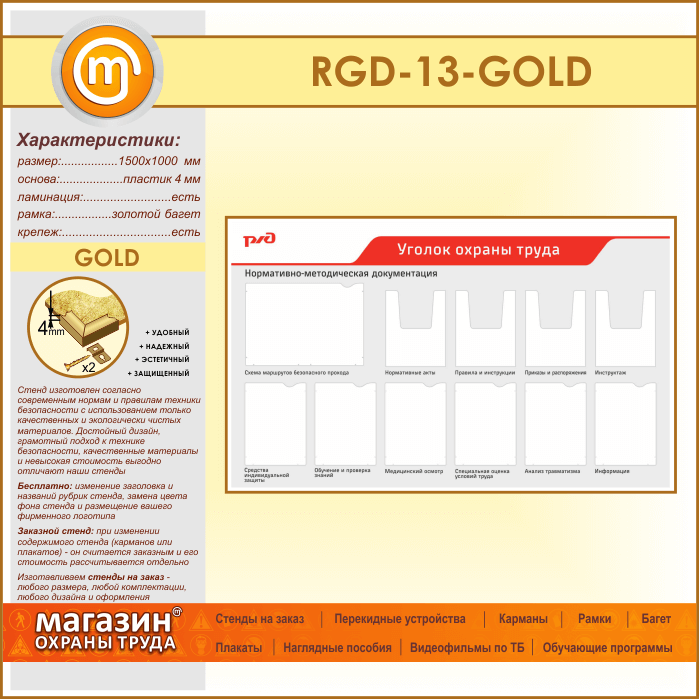 Стенд «Уголок охраны труда» с 1 плоским карманом А3 формата, 6 плоскими и 4 объемными карманами А4 формата (RGD-13-GOLD) в Альметьевске купить