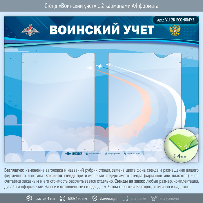 Стенд «Воинский учет» с 2 карманами А4 формата (VU-2K-ECONOMY2) в Альметьевске купить