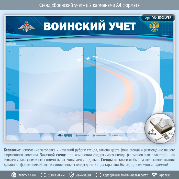 Стенд «Воинский учет» с 2 карманами А4 формата (VU-2K-SILVER) в Альметьевске купить